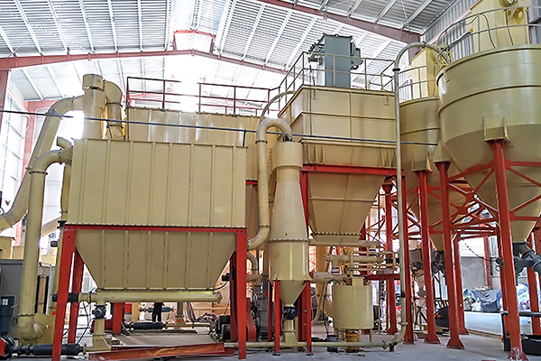 大塊物料經(jīng)破碎機破碎到所需粒度(30mm)后,由提升機將物料送至儲料斗,再由皮帶機將物料均勻定量連續(xù)地送入主機磨室磨粉機內(nèi)進行研磨。粉磨后的物料被風(fēng)機氣流送入選粉機進行分級。在選粉機葉輪的作用下,不符合細(xì)度要求的物料落入磨室內(nèi)重新碾磨;合格的物料則經(jīng)空氣斜槽進入旋風(fēng)集粉器內(nèi),進行分離收集,經(jīng)排料裝置排出即為成品粉體。整個過程屬于閉路循環(huán)系統(tǒng),并在正負(fù)壓狀態(tài)下運行,配備以脈沖除塵器,保證了生產(chǎn)現(xiàn)場的干凈、整潔。